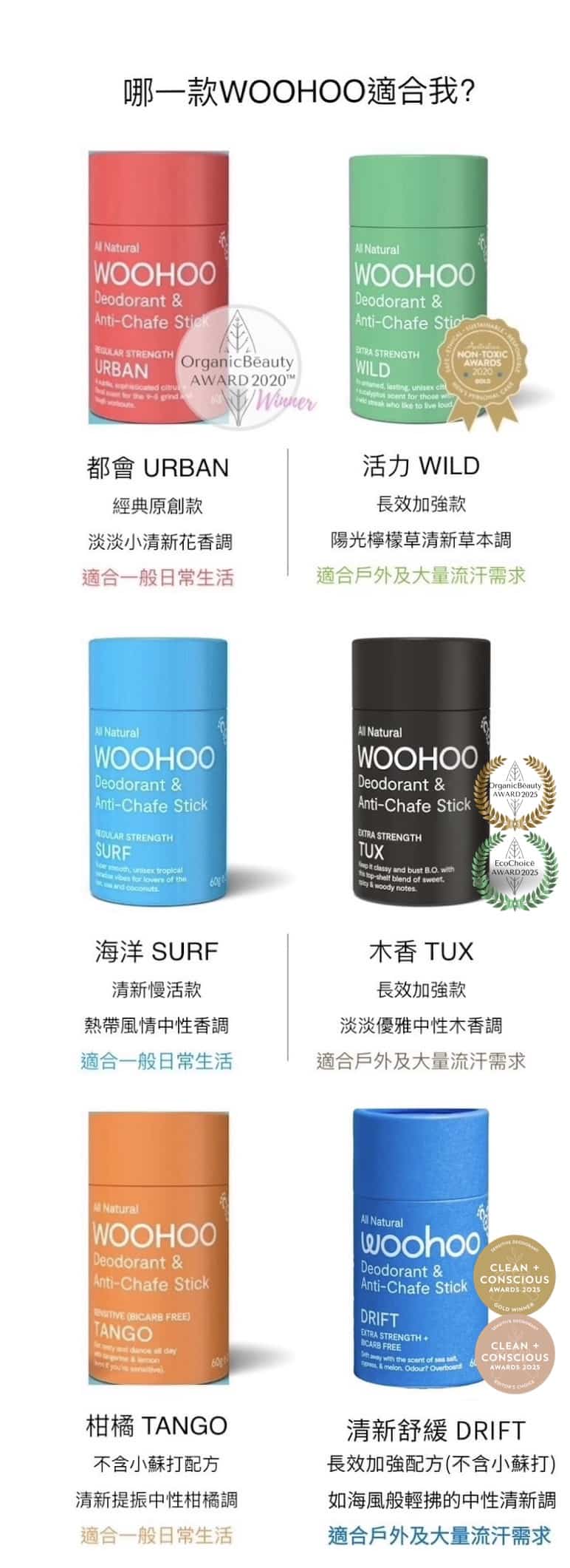 Woohoo目前有6款體香棒; 都會(紅色)60g 、活力(綠色)60g、海洋(藍色)60g:、木香(黑色)60g、柑橘(橘色)60g、清新舒緩(深藍)60g可選,隨時隨地享受清新無負擔的舒適自在!